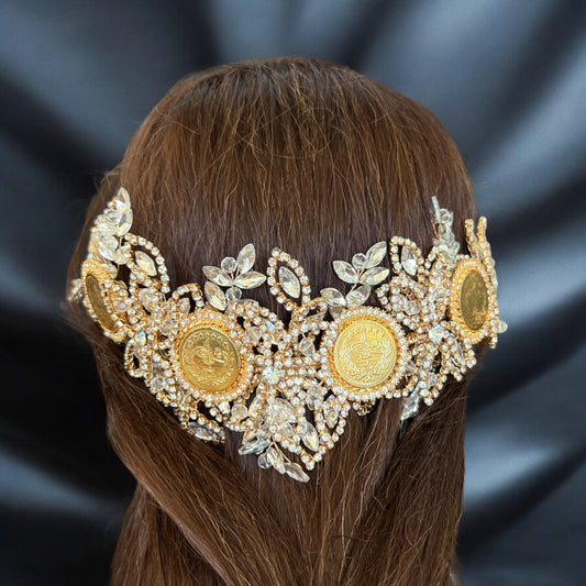 Elevate your look with the Qalunya four coins crystal headpiece. With a luxurious 10 inch...
