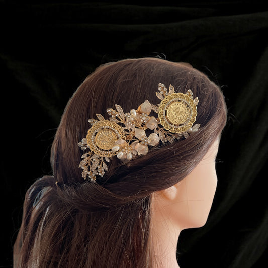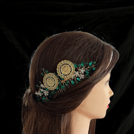 Introducing the Der Al Balah two coin gold and green pearls comb. These 6-inch pearls...