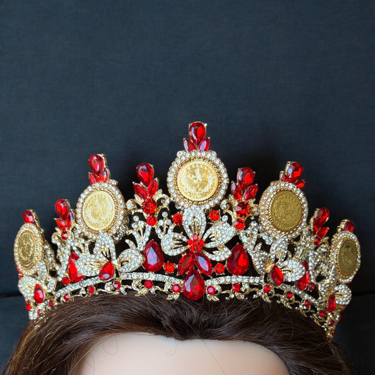 This Kafr Thulth red and gold luxury crown features a stunning design of five coins,...