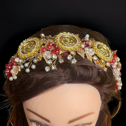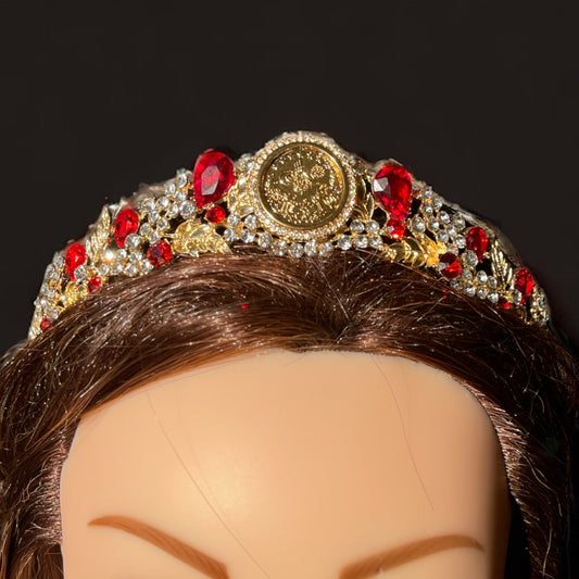 Elevate your traditional attire with the Dayr Tarif Gold and Red Tiara. Made with fancy...