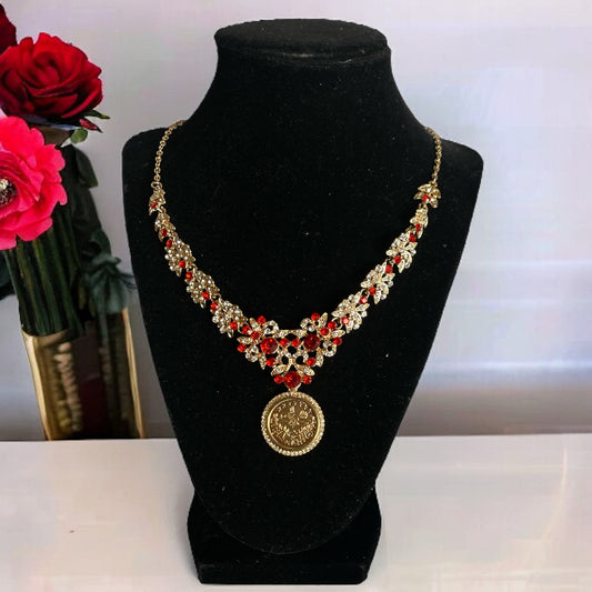 This stunning Al-Ramla Gold and Red Necklace features a vibrant red and gold coin design,...