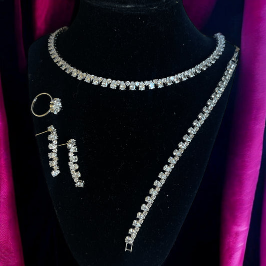 This elegant Beddu bridal set includes a necklace, earrings, ring, and bracelet, displaying a simple...