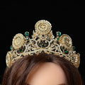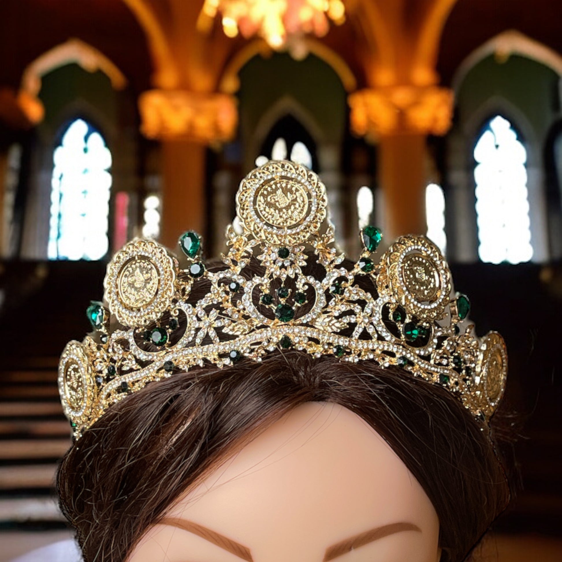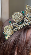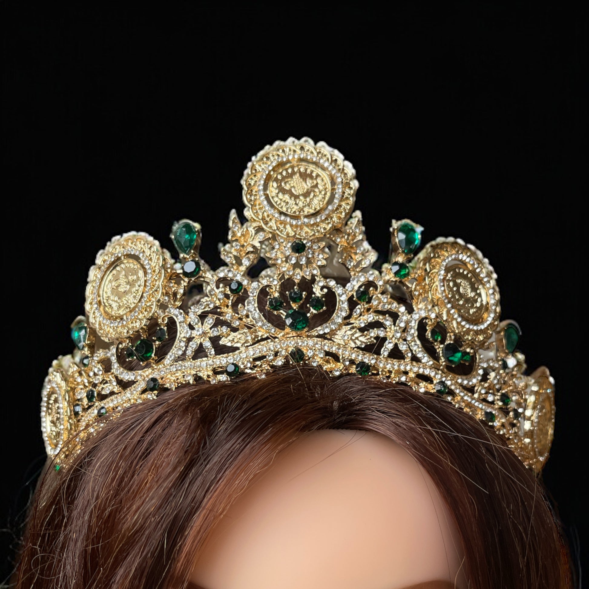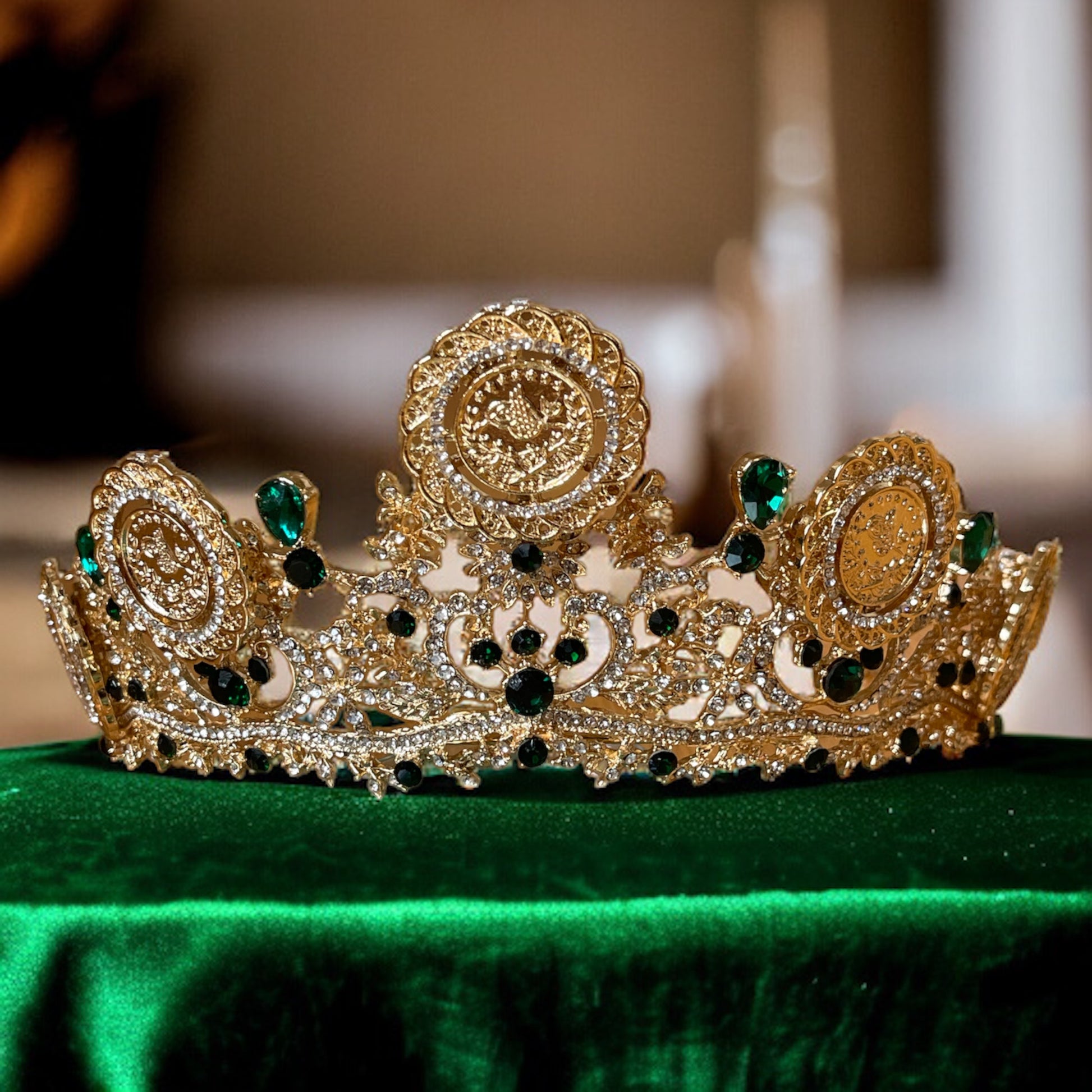 Elevate your bridal look with the Bayt Jala Gold and Green Crown. This stunning piece features a queen-worthy crystal and a shimmering green stone, providing a regal touch to any wedding. With its lustrous design, stand out as a queen and shine like royalty on your special day.