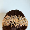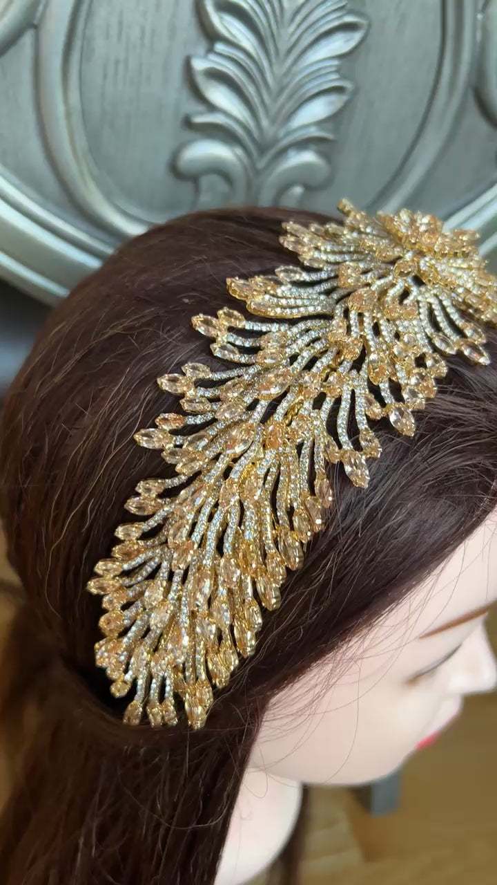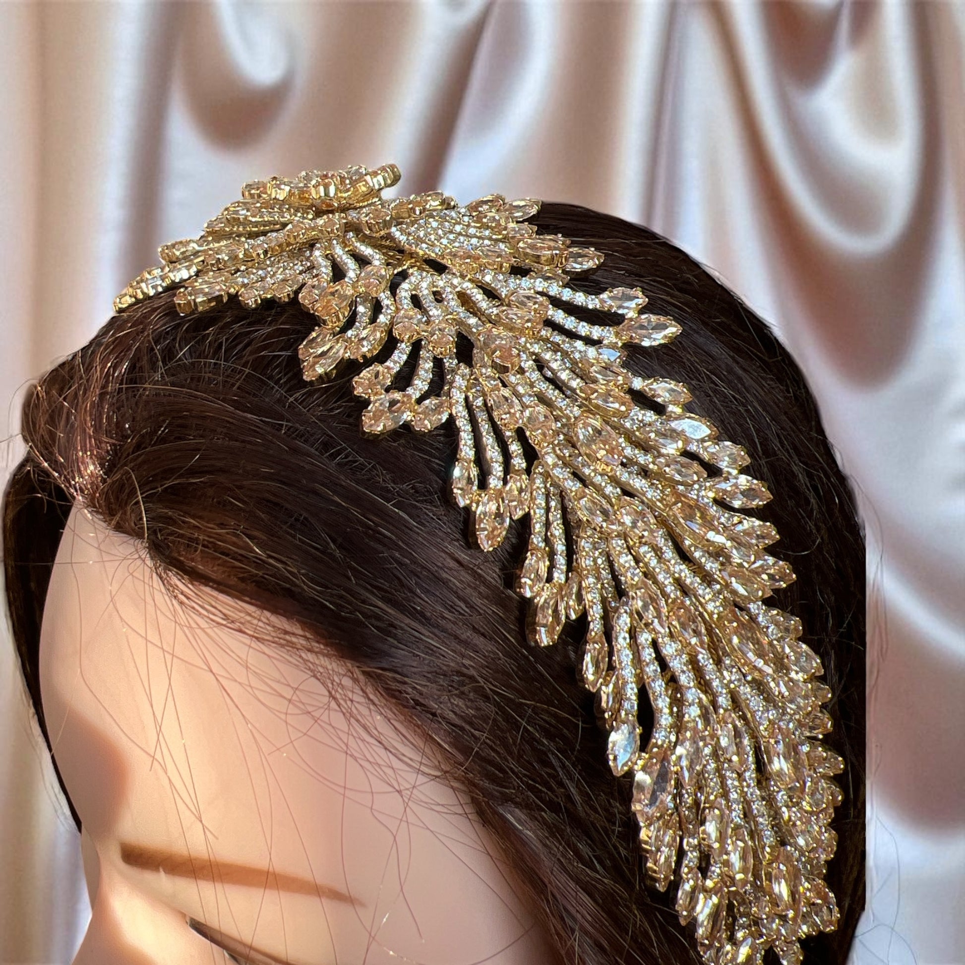 This exquisite headpiece features an easy structure for effortless wearing. Measuring 14 inches long and 2.5 inches wide, it's perfect for any special occasion. Its gold and champagne design adds a touch of elegance and sophistication to any outfit.