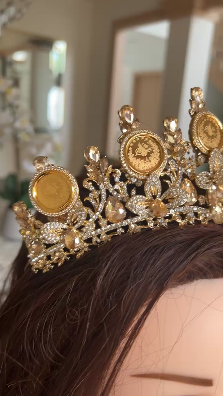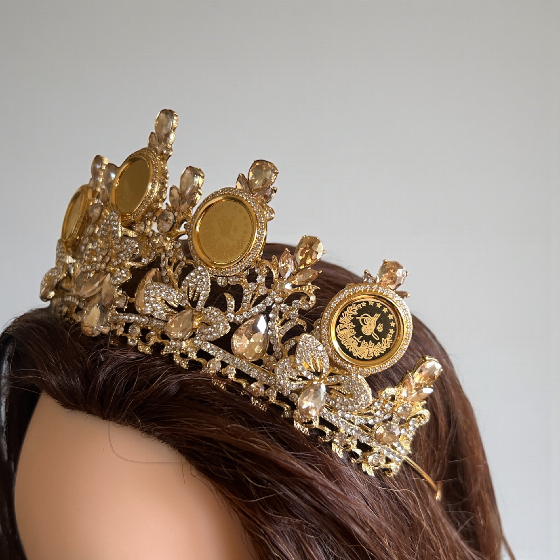This Deir Dibwan Gold and Champagne Crown is a luxurious accessory, standing three inches high from the middle. Crafted with intricate details and high-quality materials, this crown exudes elegance and sophistication. Perfect for formal occasions or adding a touch of opulence to any outfit.