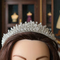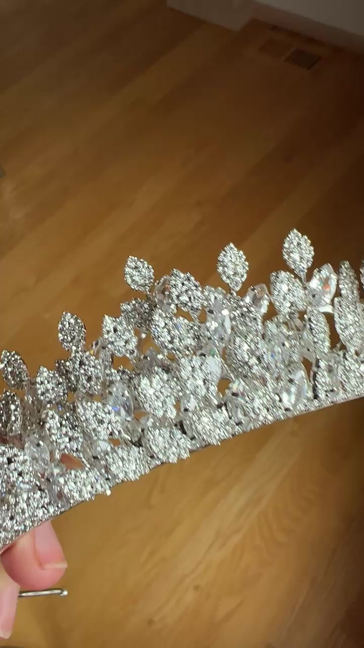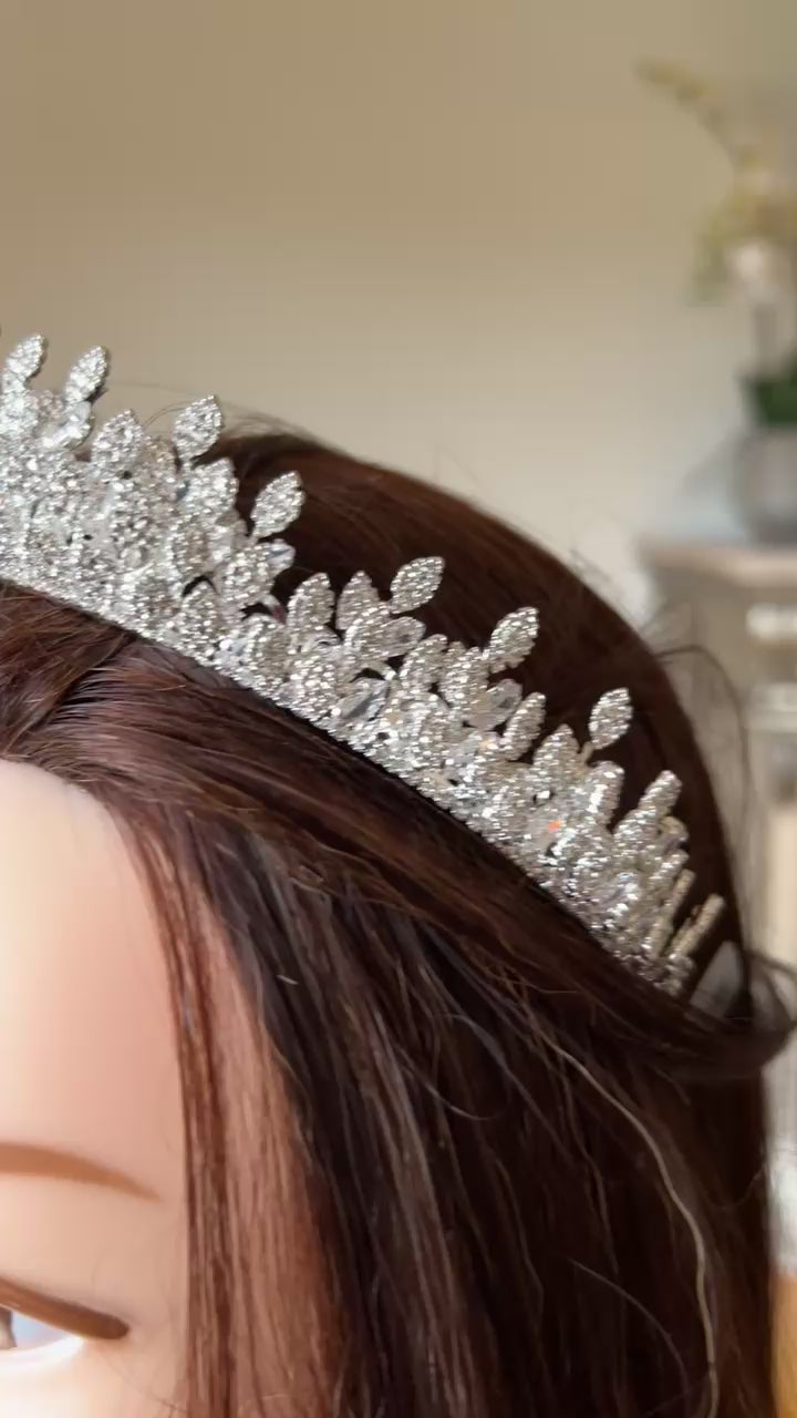 Elevate your wedding look with the Kafr Sumei silver tiara. Crafted with luxury in mind, this tiara features a stunning 1.3 inch height from the middle, adorned with sparkling zircon stones. Perfect for adding a touch of glamour to your special day.