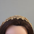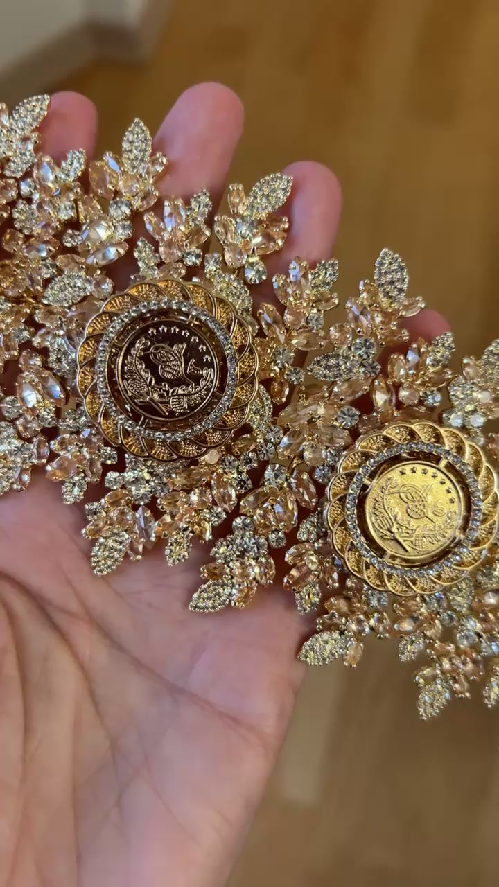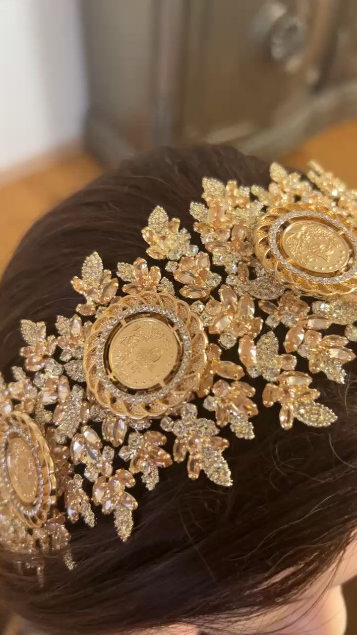 Experience the ultimate luxury with our Khirbat Jiddin five coins honey and gold headpiece. Made with the finest materials, this 3-inch wide headpiece is both easy to wear and shape, ensuring a comfortable and stylish fit for any occasion. Elevate your look with its elegant design and expert craftsmanship.