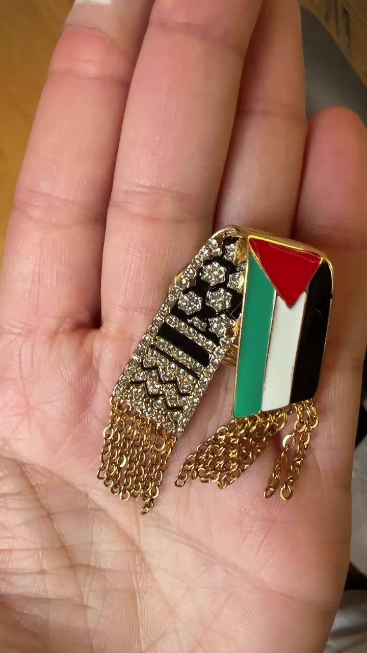 Show your support for the Palestinian people and their struggle for justice and freedom with our Kufya And Palestinian II Flag Brooch. Measuring 1.7 inches long and 1.2 inches wide, this brooch is a subtle yet powerful way to make a statement. Stay stylish while standing in solidarity.