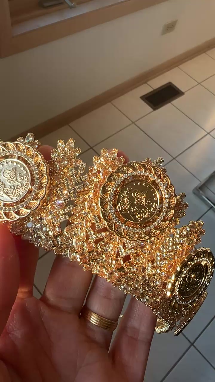 Experience royalty with the Ramallah II five coins luxury crown. At 2.2 inches tall, the crown stands out from the crowd, adding an air of opulence to any outfit. Perfect for special occasions, this crown is a must-have for those who want to make a statement.