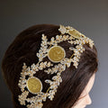 This crystal headpiece adds a luxurious touch to any look with its intricate design and impressive 14-inch length. Measuring at 3 inches wide, it is the perfect statement piece for any occasion. Elevate your style with Sebastia Four Coins.